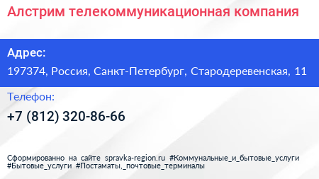 Алстрим, телекоммуникационная компания по адресу 197374, Россия, Санкт-Петербург, Стародеревенская, 11 в дальнейшем Организация, размещена в следующих категориях:
