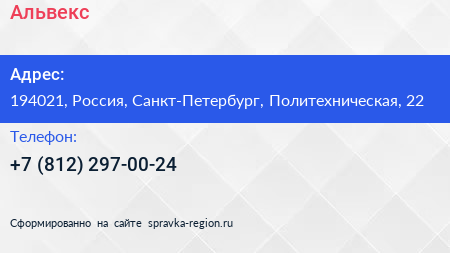 Альвекс по адресу 194021, Россия, Санкт-Петербург, Политехническая, 22 в дальнейшем Организация, размещена в следующих категориях: