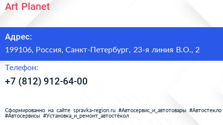 Art Planet по адресу 199106, Россия, Санкт-Петербург, 23-я линия В.О., 2 в дальнейшем Организация, размещена в следующих категориях: