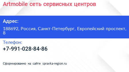 Artmobile, сеть сервисных центров по адресу 188692, Россия, Санкт-Петербург, Европейский проспект, 8 в дальнейшем Организация, размещена в следующих категориях: