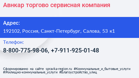 Авнкар, торгово-сервисная компания по адресу 192102, Россия, Санкт-Петербург, Салова, 53 к1 в дальнейшем Организация, размещена в следующих категориях: