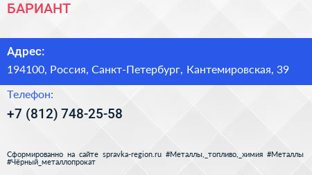 БАРИАНТ по адресу 194100, Россия, Санкт-Петербург, Кантемировская, 39 в дальнейшем Организация, размещена в следующих категориях: