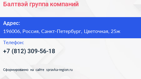 Балтвэй, группа компаний по адресу 196006, Россия, Санкт-Петербург, Цветочная, 25ж в дальнейшем Организация, размещена в следующих категориях: