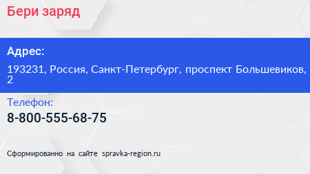 Бери заряд по адресу 193231, Россия, Санкт-Петербург, проспект Большевиков, 2 в дальнейшем Организация, размещена в следующих категориях: