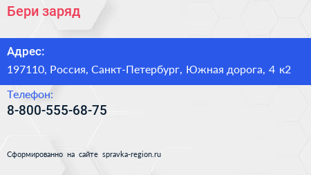 Бери заряд по адресу 197110, Россия, Санкт-Петербург, Южная дорога, 4 к2 в дальнейшем Организация, размещена в следующих категориях: