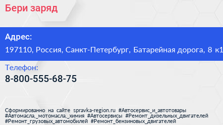 Бери заряд по адресу 197110, Россия, Санкт-Петербург, Батарейная дорога, 8 к1 в дальнейшем Организация, размещена в следующих категориях: