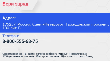 Бери заряд по адресу 195257, Россия, Санкт-Петербург, Гражданский проспект, 100 лит Б в дальнейшем Организация, размещена в следующих категориях: