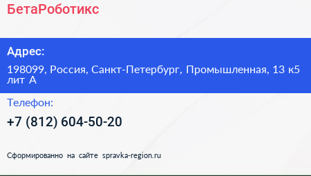БетаРоботикс по адресу 198099, Россия, Санкт-Петербург, Промышленная, 13 к5 лит А в дальнейшем Организация, размещена в следующих категориях: