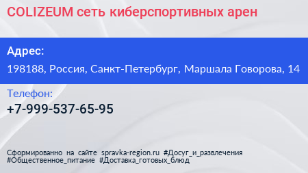 COLIZEUM, сеть киберспортивных арен по адресу 198188, Россия, Санкт-Петербург, Маршала Говорова, 14 в дальнейшем Организация, размещена в следующих категориях: