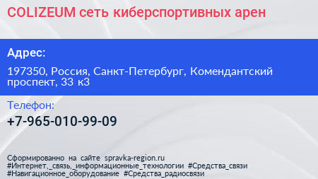 COLIZEUM, сеть киберспортивных арен по адресу 197350, Россия, Санкт-Петербург, Комендантский проспект, 33 к3 в дальнейшем Организация, размещена в следующих категориях: