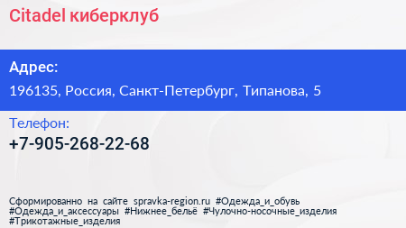 Citadel, киберклуб по адресу 196135, Россия, Санкт-Петербург, Типанова, 5 в дальнейшем Организация, размещена в следующих категориях: