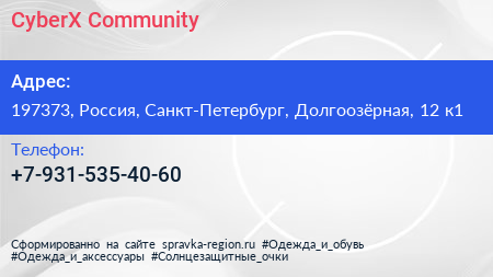 CyberX Community по адресу 197373, Россия, Санкт-Петербург, Долгоозёрная, 12 к1 в дальнейшем Организация, размещена в следующих категориях: