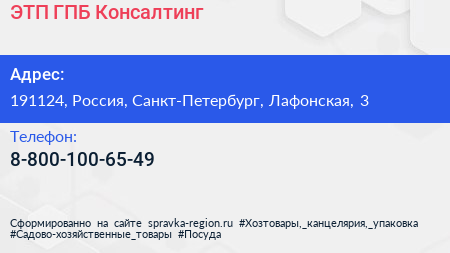 ЭТП ГПБ Консалтинг по адресу 191124, Россия, Санкт-Петербург, Лафонская, 3 в дальнейшем Организация, размещена в следующих категориях: