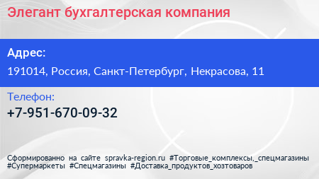Элегант, бухгалтерская компания по адресу 191014, Россия, Санкт-Петербург, Некрасова, 11 в дальнейшем Организация, размещена в следующих категориях: