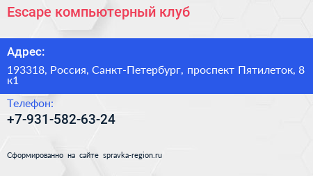 Escape, компьютерный клуб по адресу 193318, Россия, Санкт-Петербург, проспект Пятилеток, 8 к1 в дальнейшем Организация, размещена в следующих категориях: