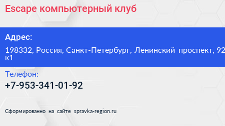 Escape, компьютерный клуб по адресу 198332, Россия, Санкт-Петербург, Ленинский проспект, 92 к1 в дальнейшем Организация, размещена в следующих категориях:
