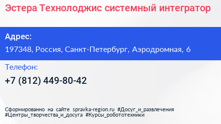 Эстера Технолоджис, системный интегратор по адресу 197348, Россия, Санкт-Петербург, Аэродромная, 6 в дальнейшем Организация, размещена в следующих категориях: