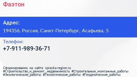 Фаэтон по адресу 194356, Россия, Санкт-Петербург, Асафьева, 5 в дальнейшем Организация, размещена в следующих категориях: