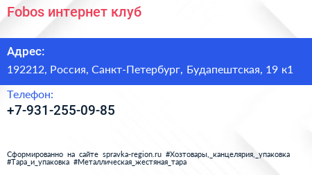Fobos, интернет-клуб по адресу 192212, Россия, Санкт-Петербург, Будапештская, 19 к1 в дальнейшем Организация, размещена в следующих категориях: