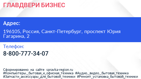 ГЛАВДВЕРИ БИЗНЕС по адресу 196105, Россия, Санкт-Петербург, проспект Юрия Гагарина, 2 в дальнейшем Организация, размещена в следующих категориях: