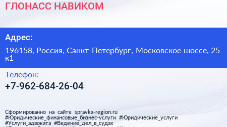 ГЛОНАСС-НАВИКОМ по адресу 196158, Россия, Санкт-Петербург, Московское шоссе, 25 к1 в дальнейшем Организация, размещена в следующих категориях: