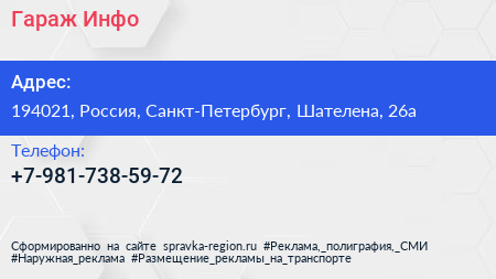 Гараж Инфо по адресу 194021, Россия, Санкт-Петербург, Шателена, 26а в дальнейшем Организация, размещена в следующих категориях: