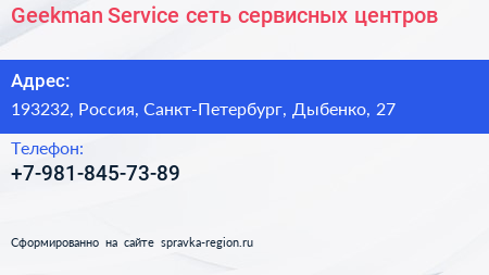 Geekman Serviсe, сеть сервисных центров по адресу 193232, Россия, Санкт-Петербург, Дыбенко, 27 в дальнейшем Организация, размещена в следующих категориях: