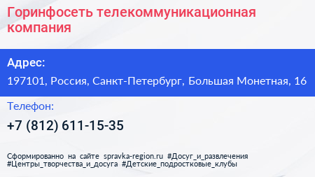 Горинфосеть, телекоммуникационная компания по адресу 197101, Россия, Санкт-Петербург, Большая Монетная, 16 в дальнейшем Организация, размещена в следующих категориях: