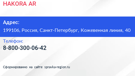 HAKORA AR по адресу 199106, Россия, Санкт-Петербург, Кожевенная линия, 40 в дальнейшем Организация, размещена в следующих категориях: