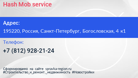 Hash-Mob service по адресу 195220, Россия, Санкт-Петербург, Богословская, 4 к1 в дальнейшем Организация, размещена в следующих категориях:
