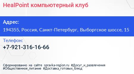 HealPoint, компьютерный клуб по адресу 194355, Россия, Санкт-Петербург, Выборгское шоссе, 15 в дальнейшем Организация, размещена в следующих категориях: