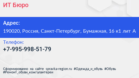 ИТ Бюро по адресу 190020, Россия, Санкт-Петербург, Бумажная, 16 к1 лит А в дальнейшем Организация, размещена в следующих категориях:
