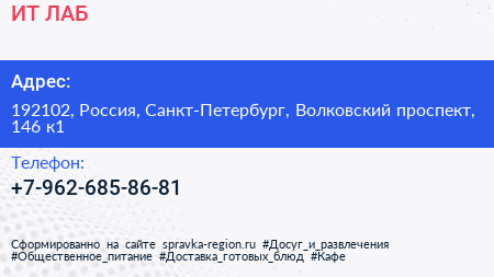 ИТ ЛАБ по адресу 192102, Россия, Санкт-Петербург, Волковский проспект, 146 к1 в дальнейшем Организация, размещена в следующих категориях: