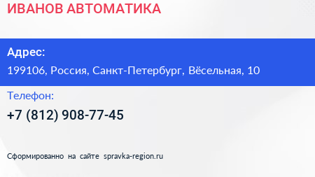 ИВАНОВ АВТОМАТИКА по адресу 199106, Россия, Санкт-Петербург, Вёсельная, 10 в дальнейшем Организация, размещена в следующих категориях:
