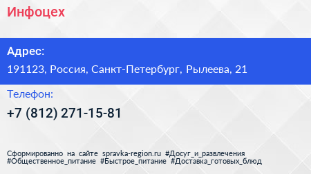 Инфоцех по адресу 191123, Россия, Санкт-Петербург, Рылеева, 21 в дальнейшем Организация, размещена в следующих категориях: