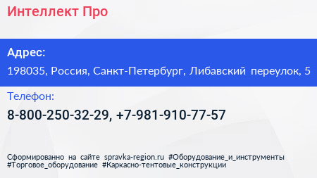 Интеллект-Про по адресу 198035, Россия, Санкт-Петербург, Либавский переулок, 5 в дальнейшем Организация, размещена в следующих категориях: