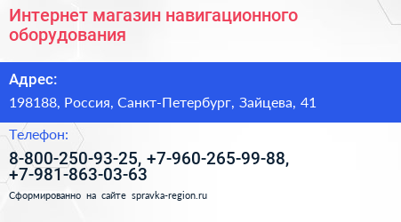 Интернет-магазин навигационного оборудования по адресу 198188, Россия, Санкт-Петербург, Зайцева, 41 в дальнейшем Организация, размещена в следующих категориях: