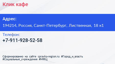 Клик, кафе по адресу 194214, Россия, Санкт-Петербург, Лиственная, 18 к1 в дальнейшем Организация, размещена в следующих категориях: