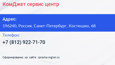 КомДжет, сервис-центр по адресу 196240, Россия, Санкт-Петербург, Костюшко, 68 в дальнейшем Организация, размещена в следующих категориях: