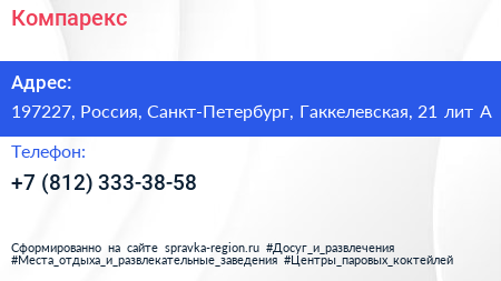 Компарекс по адресу 197227, Россия, Санкт-Петербург, Гаккелевская, 21 лит А в дальнейшем Организация, размещена в следующих категориях:
