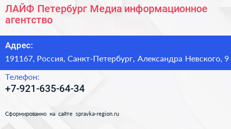 ЛАЙФ.Петербург Медиа, информационное агентство по адресу 191167, Россия, Санкт-Петербург, Александра Невского, 9 в дальнейшем Организация, размещена в следующих категориях: