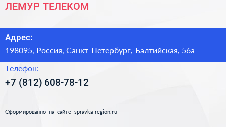 ЛЕМУР ТЕЛЕКОМ по адресу 198095, Россия, Санкт-Петербург, Балтийская, 56а в дальнейшем Организация, размещена в следующих категориях: