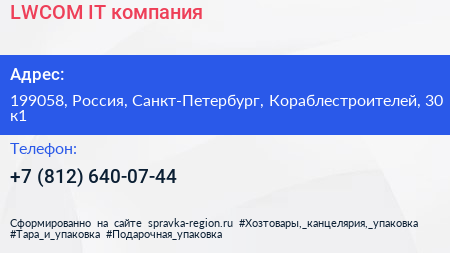 LWCOM, IT-компания по адресу 199058, Россия, Санкт-Петербург, Кораблестроителей, 30 к1 в дальнейшем Организация, размещена в следующих категориях: