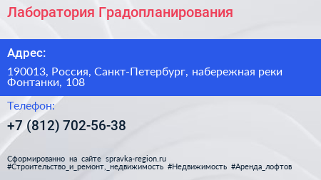 Лаборатория Градопланирования по адресу 190013, Россия, Санкт-Петербург, набережная реки Фонтанки, 108 в дальнейшем Организация, размещена в следующих категориях:
