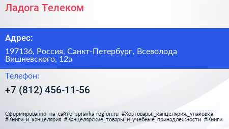 Ладога Телеком по адресу 197136, Россия, Санкт-Петербург, Всеволода Вишневского, 12а в дальнейшем Организация, размещена в следующих категориях: