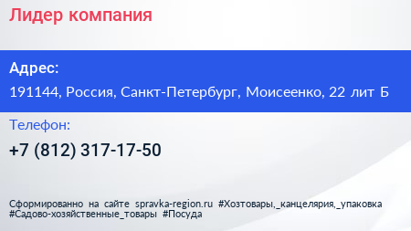 Лидер, компания по адресу 191144, Россия, Санкт-Петербург, Моисеенко, 22 лит Б в дальнейшем Организация, размещена в следующих категориях: