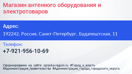 Магазин антенного оборудования и электротоваров по адресу 192242, Россия, Санкт-Петербург, Будапештская, 11 в дальнейшем Организация, размещена в следующих категориях: