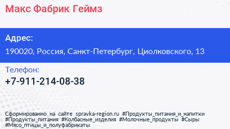 Макс Фабрик Геймз по адресу 190020, Россия, Санкт-Петербург, Циолковского, 13 в дальнейшем Организация, размещена в следующих категориях: