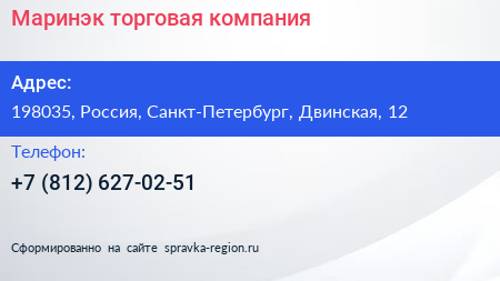 Маринэк, торговая компания по адресу 198035, Россия, Санкт-Петербург, Двинская, 12 в дальнейшем Организация, размещена в следующих категориях: