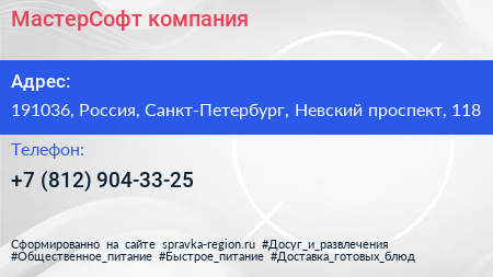 МастерСофт, компания по адресу 191036, Россия, Санкт-Петербург, Невский проспект, 118 в дальнейшем Организация, размещена в следующих категориях: